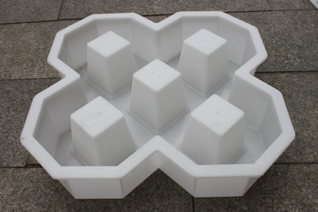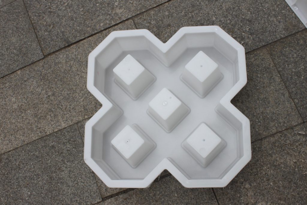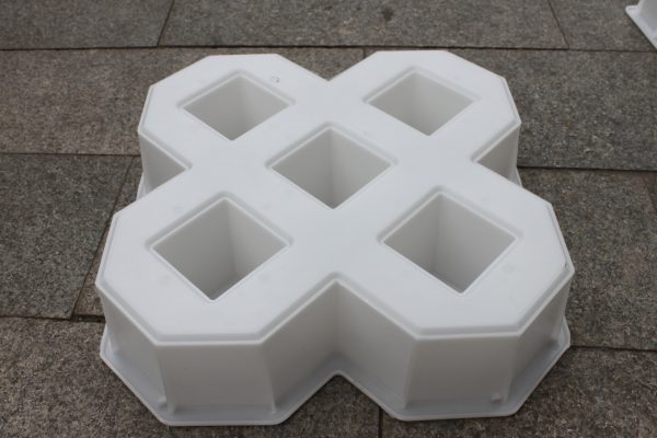 此款路面磚模具主要采用了雙八字五孔植草設(shè)計,使用聚丙烯塑料原料注塑加工而成。因其特殊的模具結(jié)構(gòu)設(shè)計,可植草空間相比其他植草磚模具大大增多,直觀可見停車場專用路面磚模具所制路面磚單一植草空隙有五處,如果組合拼接鋪設(shè),更可多增加四處,對于大面積停車場的綠色建設(shè)工程優(yōu)勢明顯。