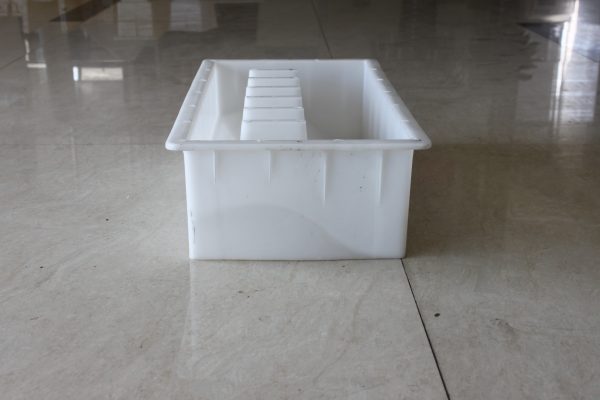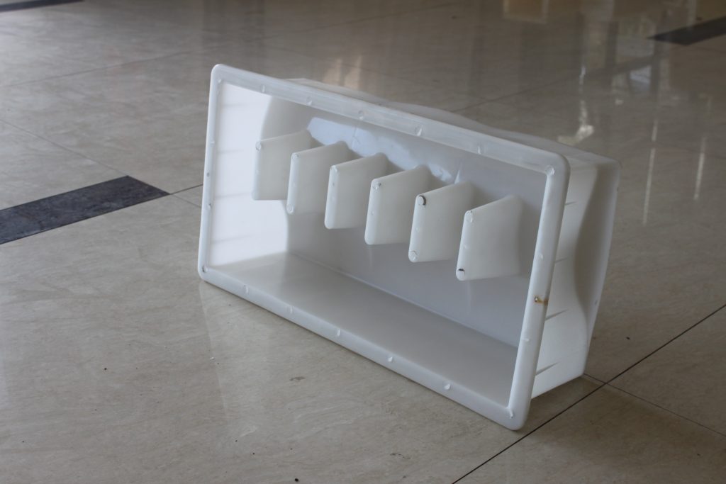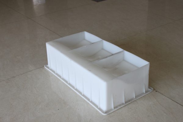 路牙石塑料模具整體外觀為長方形結構,因其尺寸較大,在模具的周邊及底部分別做了加強筋設計以保證在實際水泥路牙石澆筑過程中的穩(wěn)定性。從模具內部的結構我們可以看出,塑料路牙石模具主要采用了S型坡面設計,六個塑料堵頭,即所制水泥路牙石的六個排水孔,實際應用較多的道路段為易積水或地理位置較低區(qū)域。
