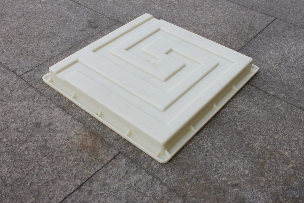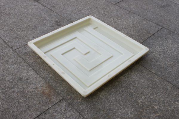整體設計樣式以方格螺旋條紋為主的步道彩磚模具模盒,藝術氣息濃厚。材質采用了在水泥制品模具相對價格稍高的ABS塑料原料,常規(guī)均為聚丙烯塑料,經過先進注塑機型熱熔成型出模,所以在質量上ABS材質的步道彩磚模具模盒更為高端。