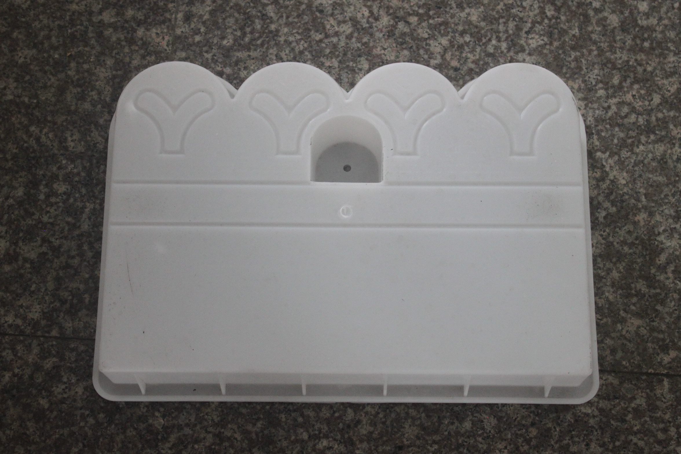 一款比較常規(guī)的水泥花池磚模具,模具花紋樣式也是市面上較為常見的人字小腳丫圖案設計,花池磚模具頂部則以圓弧四波浪結(jié)構(gòu)為主,感覺有點像花池柵欄的味道,但是實用性則更強。