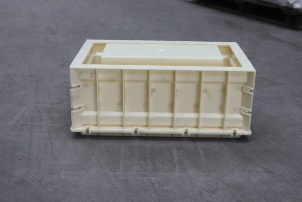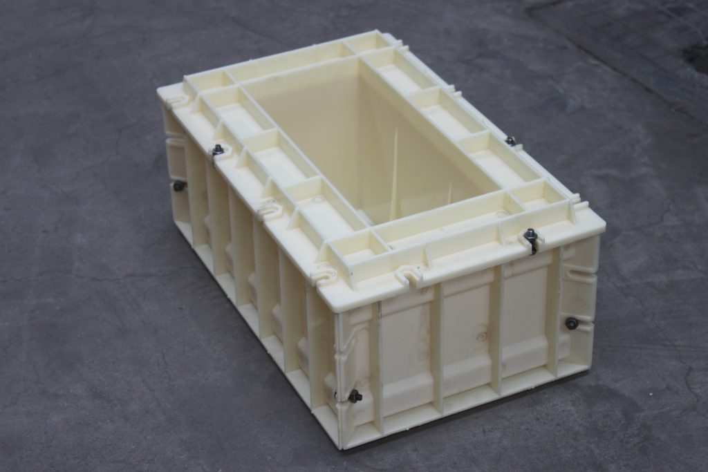 ABS材質(zhì)的空心磚塑料模具,整體呈長方形樣式,總共分為三個部分,空心磚塑料模具底座、側(cè)面短板及側(cè)面長板,在長板與短板鏈接處均采用橢圓凹槽,用于鐵質(zhì)螺絲螺帽拆卸裝配。鑒于塑料模具自身尺寸較大,為了使得空心磚塑料模具施工更為耐用牢固,在每一個配件背部分別采用十字加強筋設計,以確保正常施工。