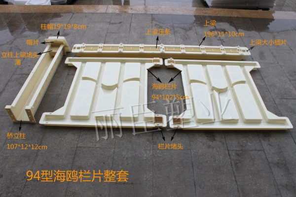 這款94型海鷗橋梁欄桿塑料模具使用的地方較為廣泛,無論是在高鐵基礎(chǔ)建設(shè)上還是高速公路的基礎(chǔ)建設(shè)上都有使用??紤]到工程要求等的因素,在用料上采用強(qiáng)度較高的ABS為主要注塑使用原料,通過款材料澆筑成型的橋梁欄桿塑模不用擔(dān)心因?yàn)槁吠具\(yùn)輸中發(fā)生的模具變形等情況,而且在澆筑過程中也保持模具自身的強(qiáng)度和極高的耐腐蝕性。