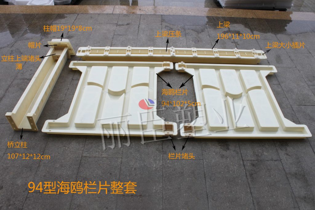 一、欄片花紋不同:那最明顯的來說便是94型護(hù)欄塑料模具在欄片的規(guī)格上進(jìn)行增加,尺寸為94*102*5cm,在圖案上也進(jìn)行略微的加工,采用較為生動的海鷗樣式為主要使用圖型。而72型護(hù)欄模具在尺寸上為72*91*5cm為主,圖案以工字型為主。72型整體欄片有AB之分,而94型整體欄片中沒有AB片的區(qū)分,在工程使用中也不用擔(dān)心欄片裝反的情況發(fā)生。