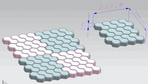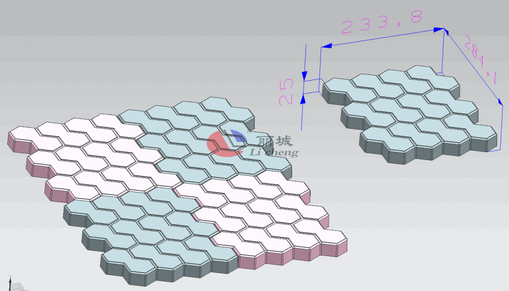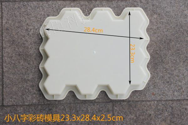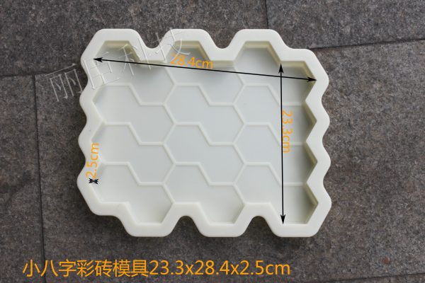 這款小八字彩磚塑料模具外觀(guān)上呈現(xiàn)出不規(guī)則形狀,遠(yuǎn)處看過(guò)去外觀(guān)有些像蜂巢的樣式,彩磚模具的規(guī)格為28.4×23.3×2.5,彩磚塑料模盒在制作過(guò)程中采用全新的ABS為主要生產(chǎn)原料,至成型后的彩磚塑料模具外觀(guān)整體呈現(xiàn)一種淡鵝黃色,其模具表面能有明顯的光澤感,下面這張圖是小八字彩磚模具澆筑成型后的模型款式。