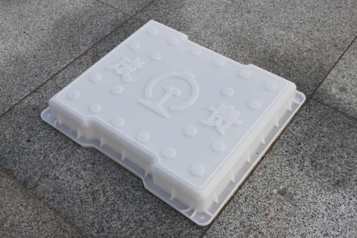 鐵路蓋板模具中圓點(diǎn)設(shè)計(jì)可以有效的起到步行防滑作用,鐵路圖標(biāo)及“成貴”字樣標(biāo)示此款產(chǎn)品為中國(guó)鐵路成貴高鐵線專用溝蓋板塑料模具。