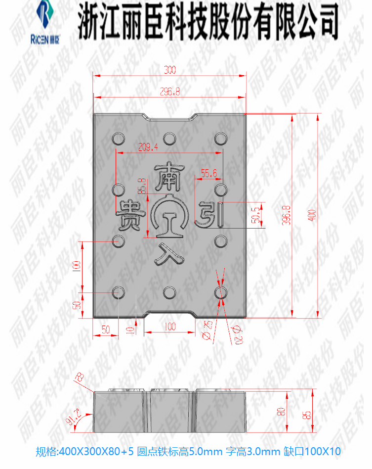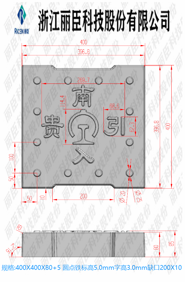 貴南引入系列蓋板,主要用于高鐵隧道蓋板定制系列、蓋板為缺口圓點(diǎn)帶鐵標(biāo)、板面帶字,為“貴南引入”。這款系列有三款尺寸蓋板尺寸分別為40cm*30cm、40cm*40cm、80cm*50cm、厚度相同為8cm厚,且三款模具的缺口也不同從小到大的尺寸缺口為10cm、20cm、30cm缺口,這款蓋板為2022年新生產(chǎn)的蓋板。
