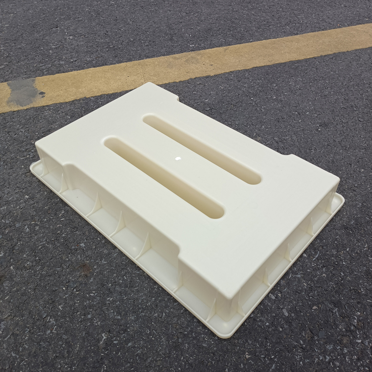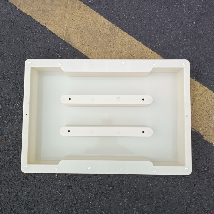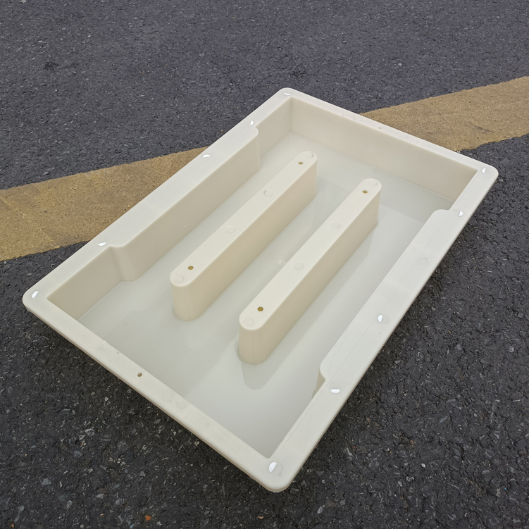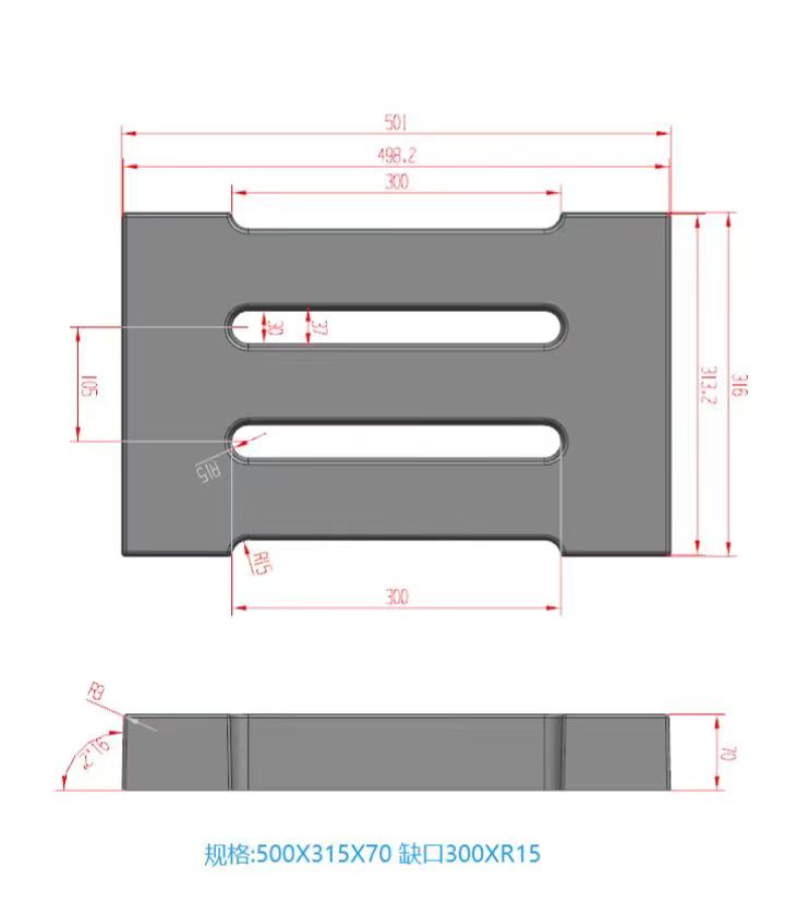 模具整體材質(zhì)采用強(qiáng)度較高的淺黃色ABS材質(zhì)制成、模具帶缺口二孔,大體尺寸為50cm*31.5cm*7cm,具體尺寸如下設(shè)計(jì)圖,模具材質(zhì)強(qiáng)度高,可以重復(fù)使用多次,擁有缺口的設(shè)計(jì)可以使雨水流通量更大,更不容易造成堵塞。
