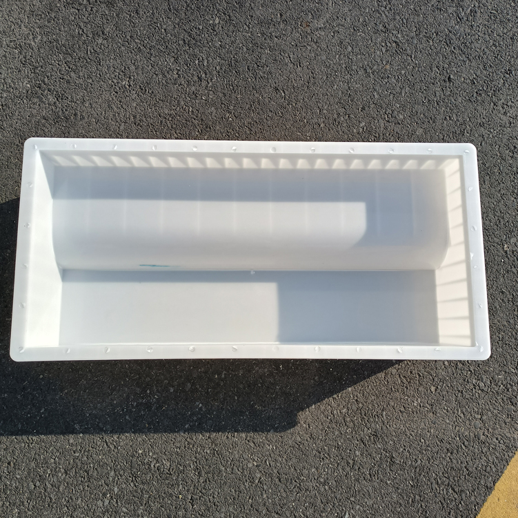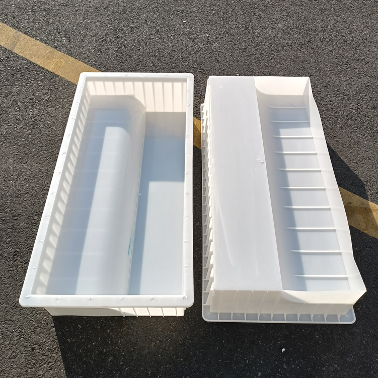 路緣排水溝塑料模具產品,主要是路緣石預制,二維尺寸設計圖如下,主要是市政道路、小區(qū)使用。預制成品模具可重復多次使用。